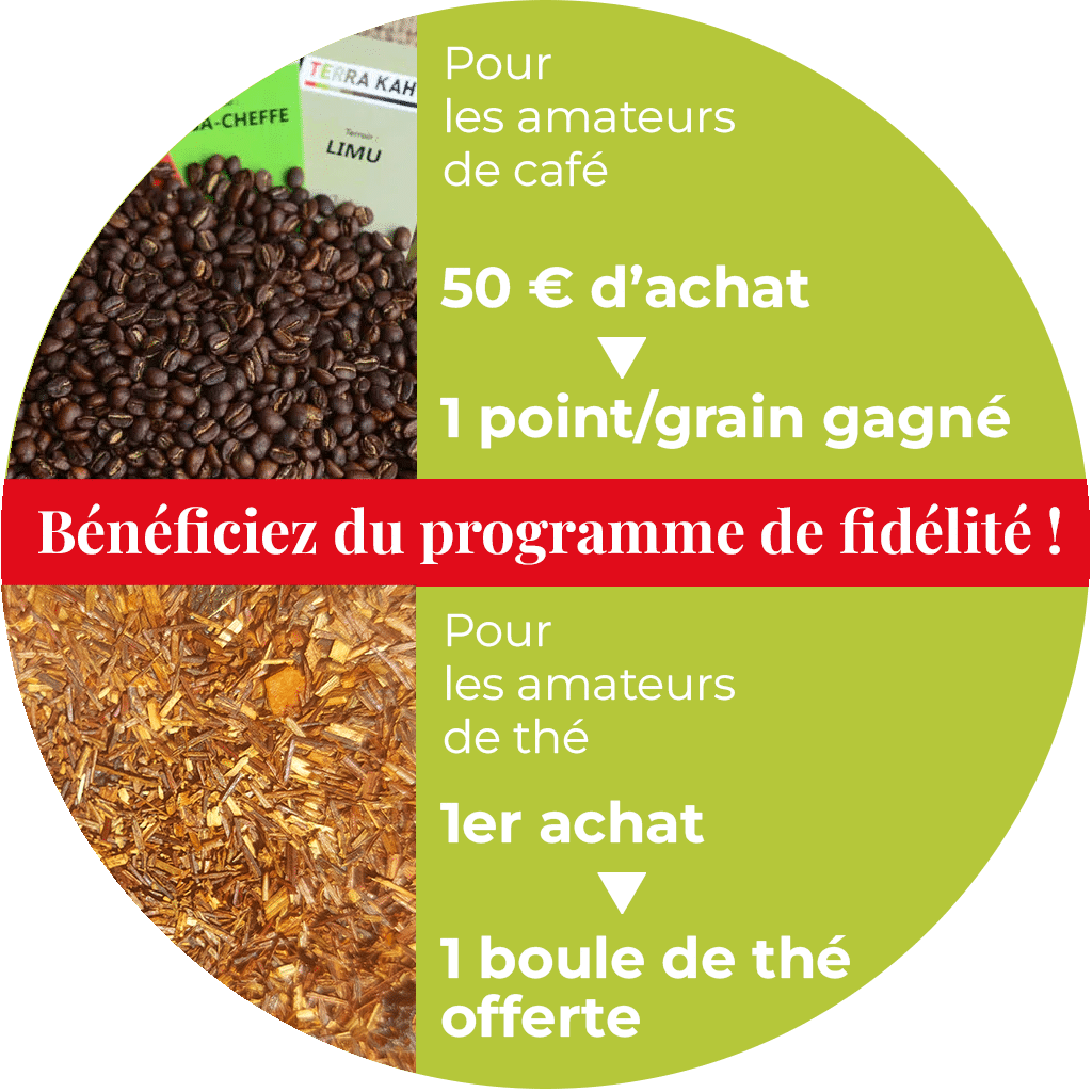 Vous trouverez vos points sous forme de « grains » de café dans vos colis, gardez-les précieusement ! Une fois vos grains cumulés , vous n’aurez qu’à sélectionner le cadeau de votre choix dans la liste ci-dessous et nous écrire sur admin@terra-kahwa.com