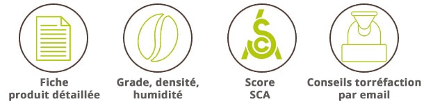 – Grade, score SCA, densité et humidité - Un accompagnement à la torréfaction par email est inclus dans notre offre.